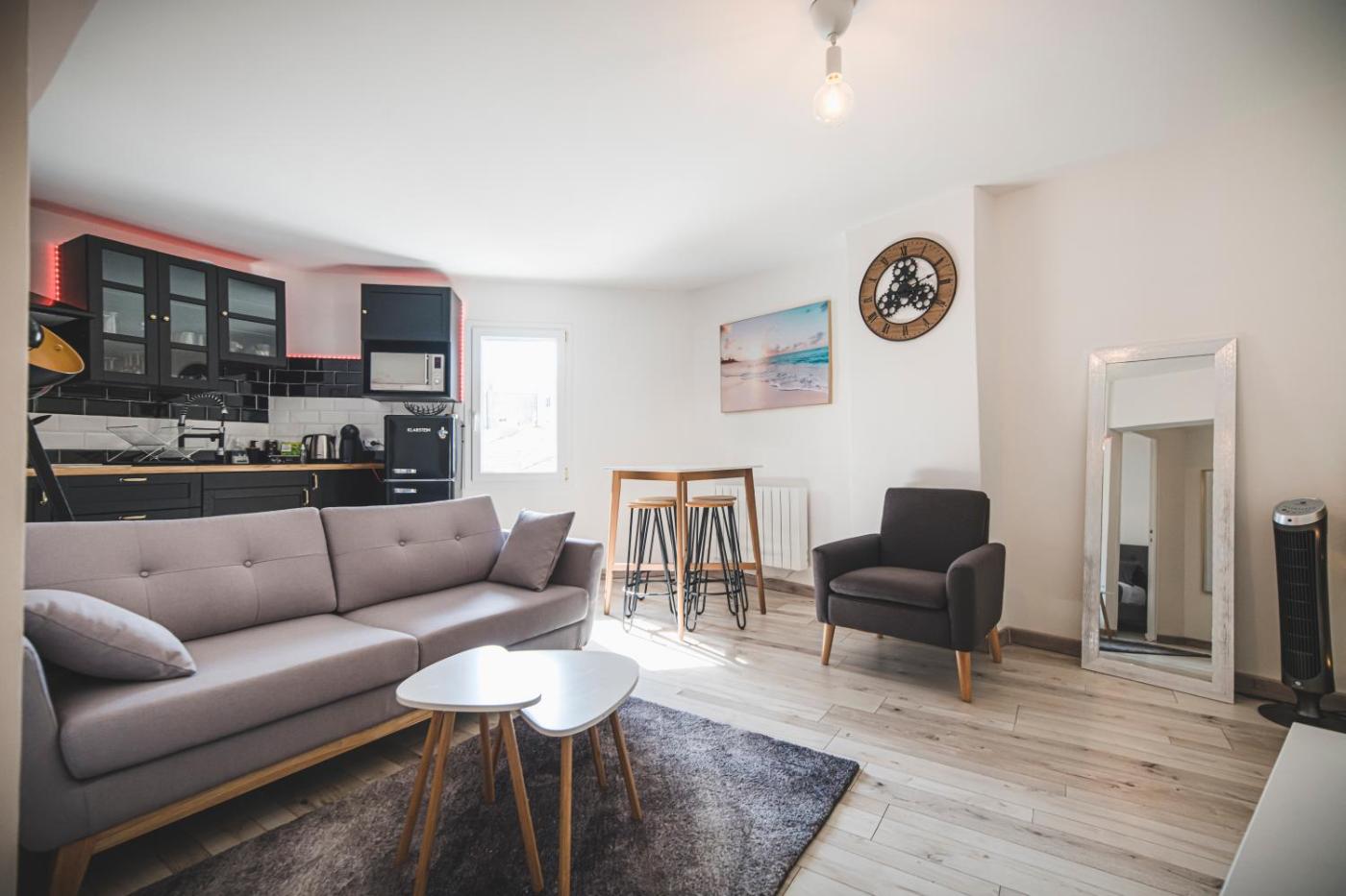 Appartement 2 Chambres. The air-conditioned apartment features 2 bedrooms and 1 bathroom with a shower and a hairdryer. The well-fitted kitchen has a stovetop, a refrigerator, kitchenware and a microwave. The apartment offers a flat-screen TV with cable channels, a washing machine, a tea and coffee maker, a dining area as well as city views. The unit offers 2 beds.