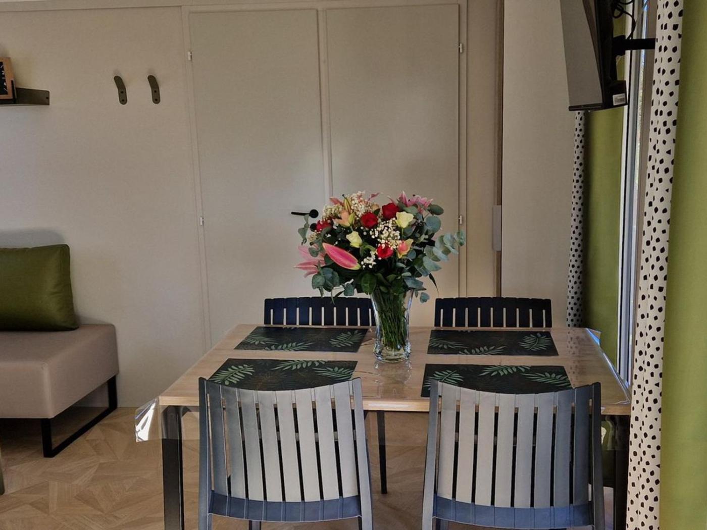 Mobile Home. Boasting 2 bedrooms and 1 bathroom with a hairdryer, this mobile home has a well-fitted kitchen and a terrace. Guests can make meals in the kitchen that has a refrigerator, kitchenware, a microwave and a toaster. The mobile home features a TV, a private entrance, a coffee machine and a dining area.